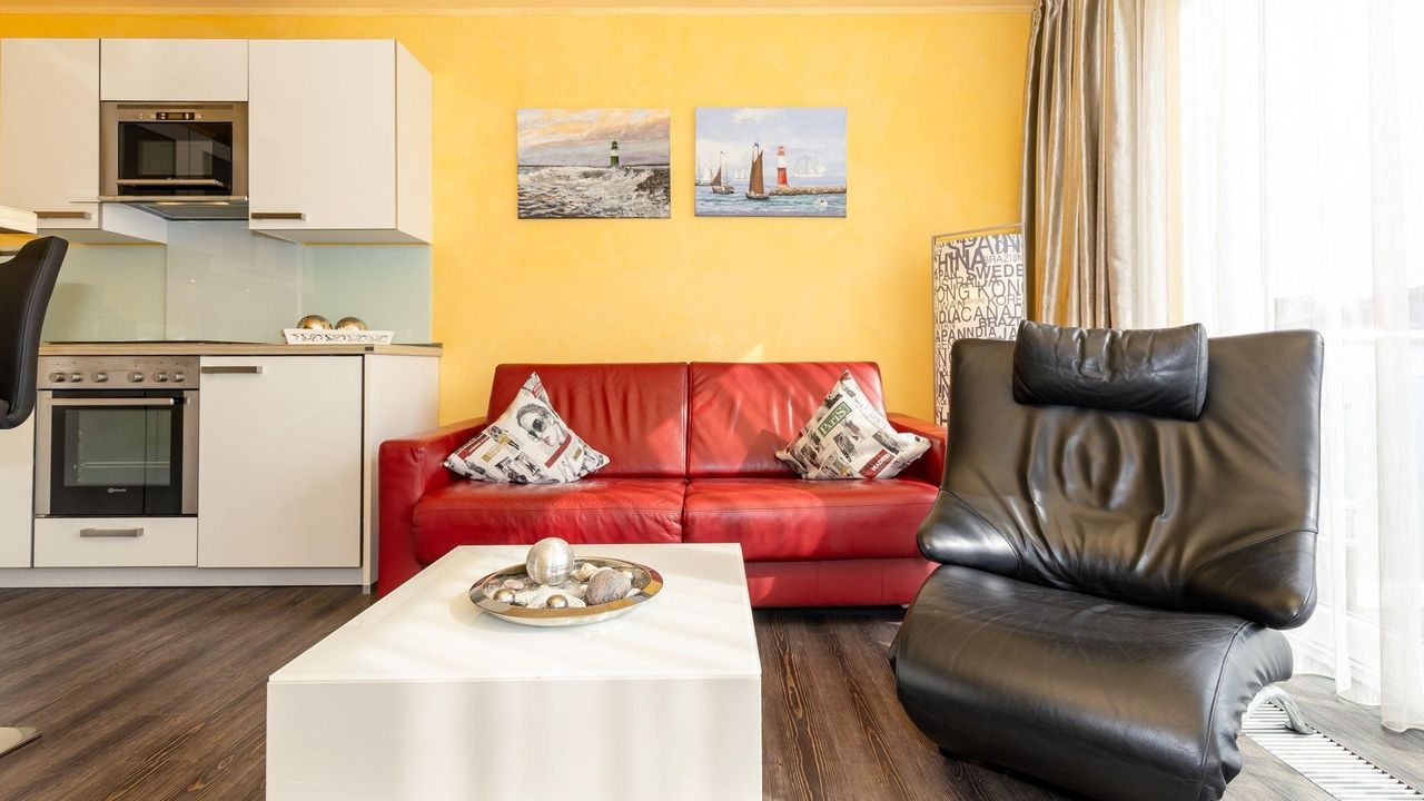 Der Wohnbereich erwartet Sie mit einem modernen roten Ledersofa, mit nur wenigen Handgriffen können Sie das Sofa zu einem Schlafplatz für eine dritte Person umfunktionieren. Auch vom bequemen Ledersessel aus können Sie das Fernsehprogramm genießen, hierfür steht Ihnen ein Flachbildschirm-Gerät zur Verfügung.