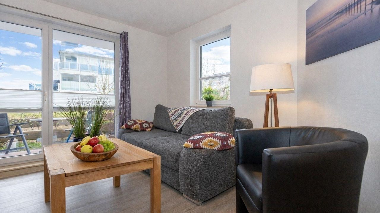 An Ihre Wohnung grenzt eine windgeschützte Terrasse zur Nordseite, die Sie direkt von Ihrem Wohnzimmer aus betreten können. Die Terrasse ist mit ansprechenden Möbeln eingerichtet, sodass Sie hier Sonne tanken oder abends bei einem Glas Wein den Tag ausklingen lassen können.