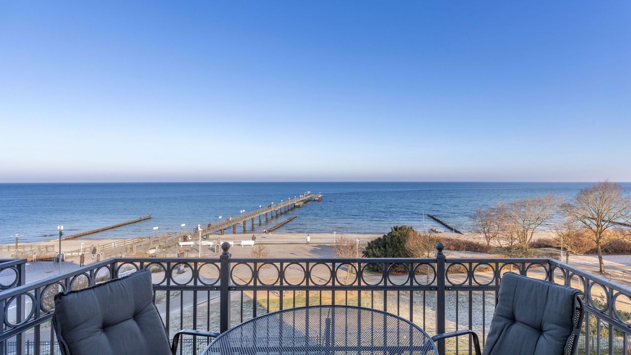 Die komfortable Ferienwohnung befindet sich im 3. Obergeschoss auf der Seeseite der Anlage und liegt unmittelbar am feinsandigen Strand von Kühlungsborn. Vom Balkon aus genießt ihr einen freien Blick auf die Ostsee, den Strand und die Seebrücke – perfekte Voraussetzungen für entspannte Urlaubstage direkt am Meer.