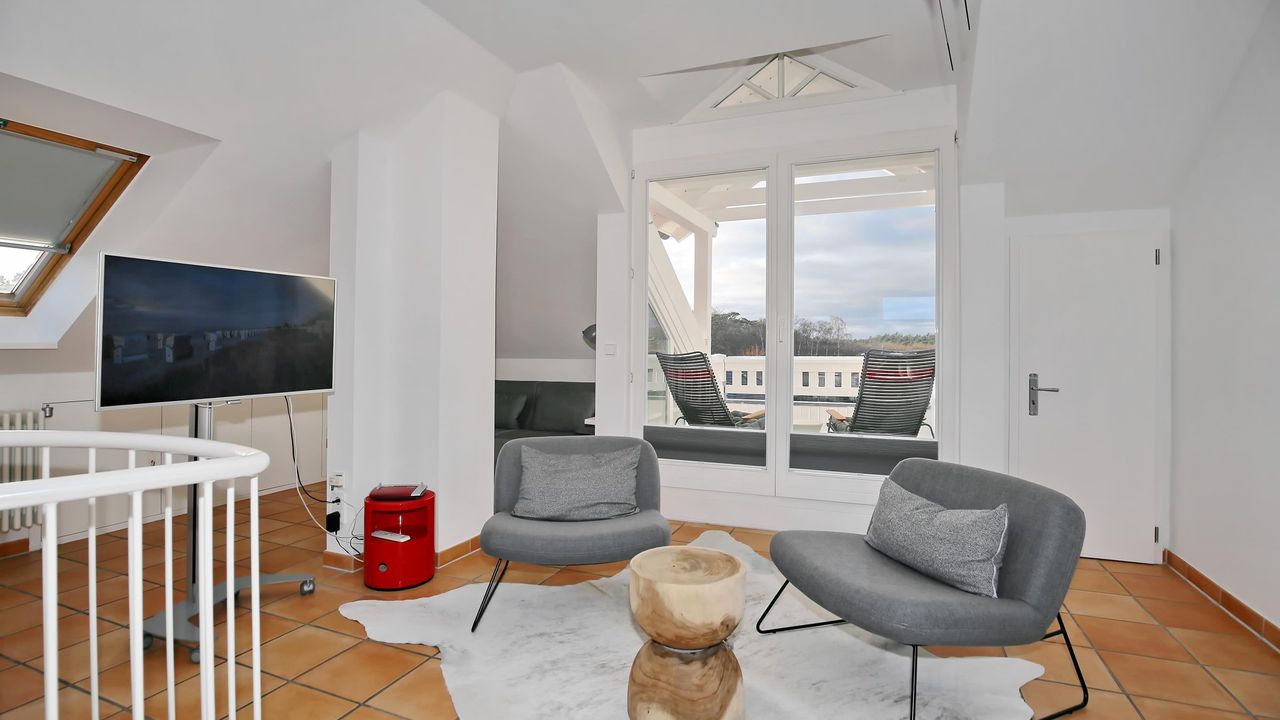 Die 62 m² große moderne Ferienwohnung liegt im 3. Obergeschoss und im Dachgeschoss der Ferienanlage. In der 2-Zimmer-Maisonette-Wohnung haben bis zu 2 Personen Platz. Auf zwei Etagen erwarten dich ein offener Wohn- und Schlafbereich, eine offene Küche mit Essbereich, eine Loggia, ein Duschbad und ein WC. Die Ferienwohnung liegt zentrumsnah und nur wenige Gehminuten vom Ortskern entfernt. Zum feinen Sandstrand und zur Seebrücke sind es etwa 800 Meter.